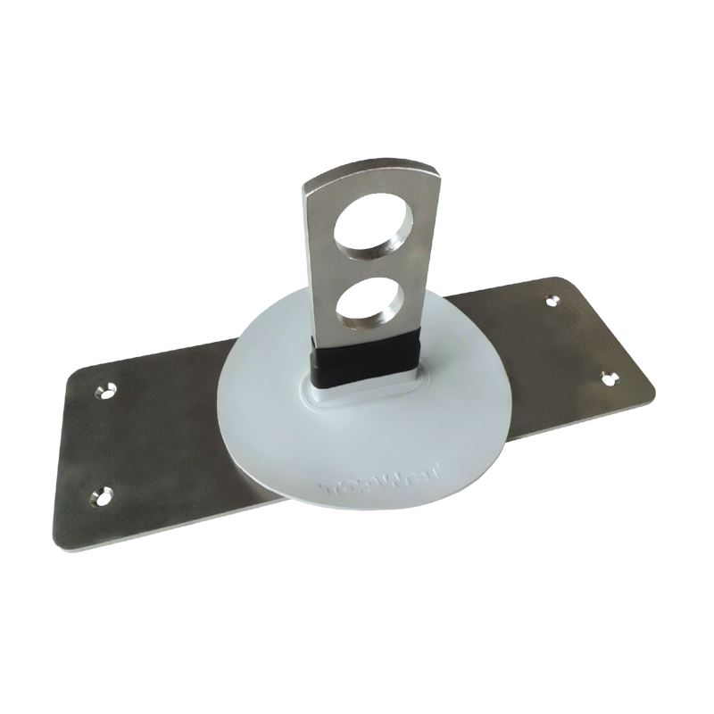 Halter aus Edelstahl für Rohr-Schneefänger mit integrierter Manschette aus PVC-Kunststoffdichtungsbahn, vorgesehen für Befestigung und Fixierung von einem oder zwei Rohren mit einem Durchmesser bis zu 28 mm.