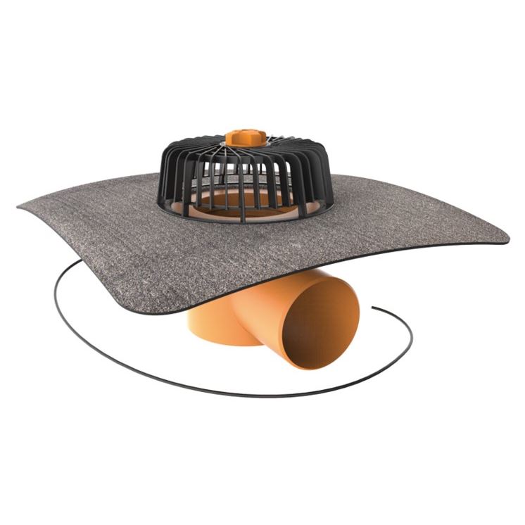 TOPWET Dachgully mit integrierter Manschette aus modifizierter Bitumenbahn, waagerechte Ausführung mit Kiesfangkorb, beheizbar mit 230 V mit Anschlusskabel.