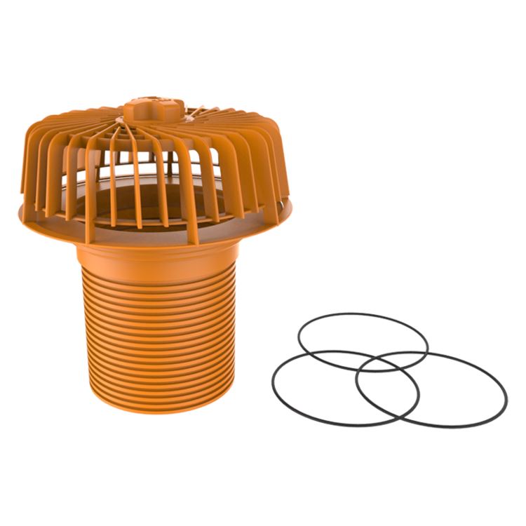 Aufstockelement für Notüberlauf auf der Dachfläche. Höhe der Überlaufkante 40 – 120 mm. Dichtringe und ein Kiesfangkorb gehören zum Produkt. Hergestellt aus Polyamid PA6, orange Farbe.