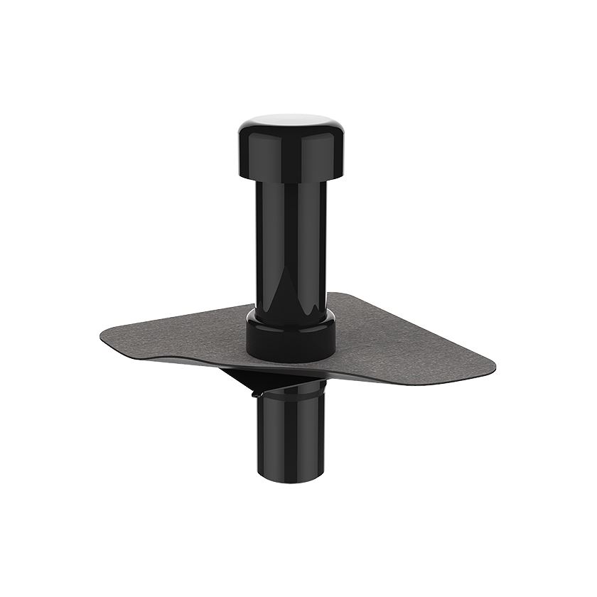 TOPWET Kanalisationsentlüftung zum Anschluss an die Entlüftungsleitung mit integrierter Manschette aus modifizierter Bitumenbahn einschließlich einer Regenschutzkappe. Höhe über der Wärmedämmung 300 mm (max. 500 mm), Tiefe unter der Wärmedämmung 300 mm (max. 1000 mm).