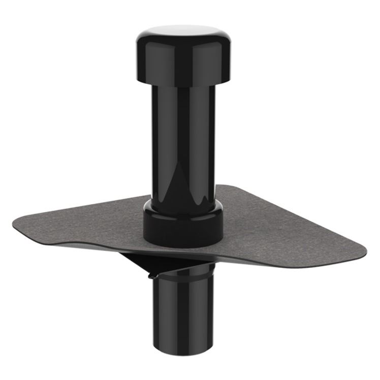 TOPWET Kanalisationsentlüftung zum Anschluss an die Entlüftungsleitung mit integrierter Manschette aus modifizierter Bitumenbahn einschließlich einer Regenschutzkappe. Höhe über der Wärmedämmung 300 mm (max. 500 mm), Tiefe unter der Wärmedämmung 300 mm (max. 1000 mm).